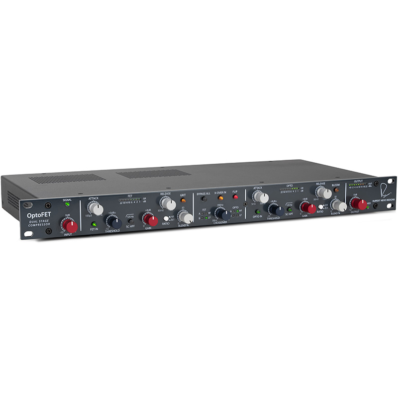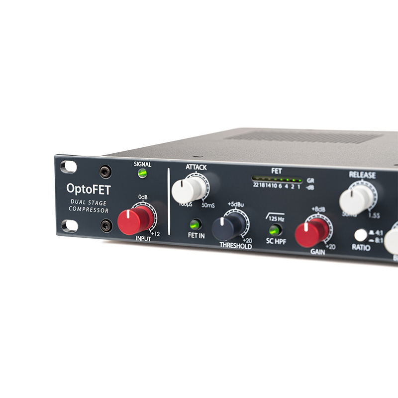OptoFET® es un compresor analógico y wave shaper que combina compresión FET y óptica en una sola unidad 1U. Ofrece modos Dual Stage (en serie) y Dual Band (graves/agudos independientes) para un control dinámico y tonal altamente creativo.
